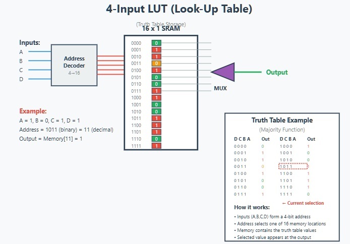 Structure: Operation: Truth Table: The diagram includes a sample truth table implementing a majority function, where the output is 1 when the majority of inputs are 1. The memory cells are color-coded to match the truth table values. This diagram helps visualize how LUTs can implement any 4-input Boolean function by simply storing the desired … Read more